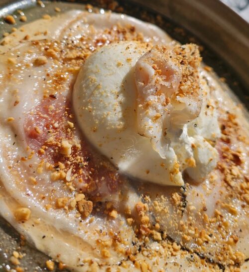 quantité de Burrata, crème de cèpes, pancetta, noisettes